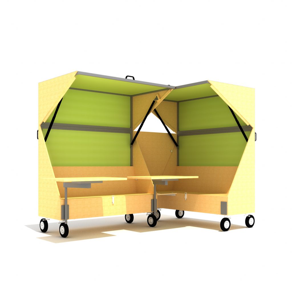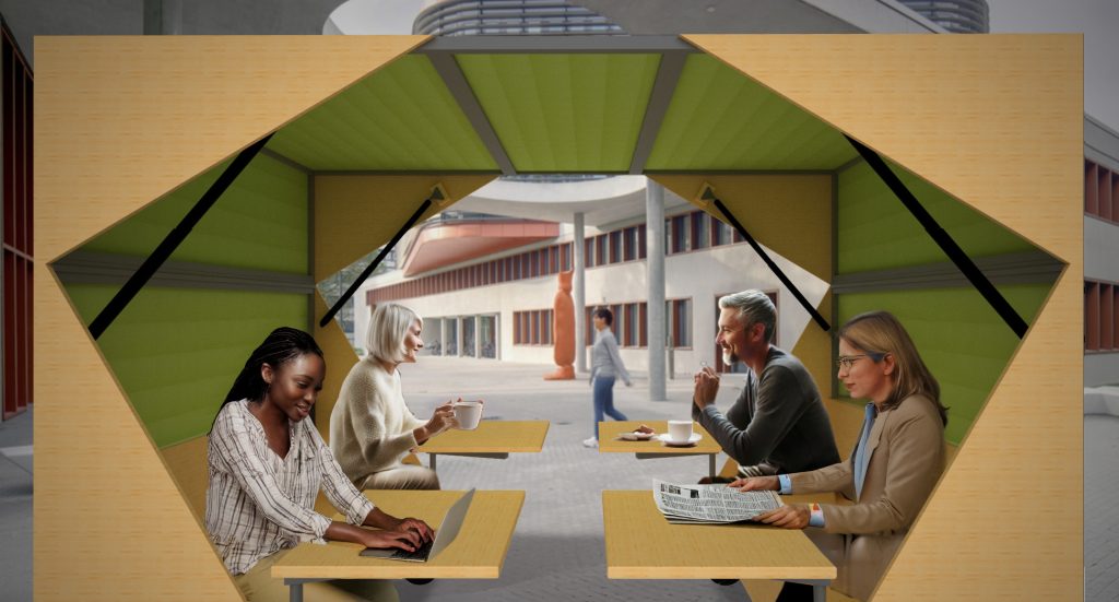 Treffpunkt, Meetingraum oder doch Telefonkabine? Esstisch, Schreibtisch oder Workshop? Die Einsatzgebiete sind groß: Ob als grünes Klassenzimmer, grünes Büro oder Vernetzungsraum oder gar Stand auf Messen – Der CoWo ist durch seine Flexibilität und Konfigurationsmöglichkeiten für vieles einsetzbar.
